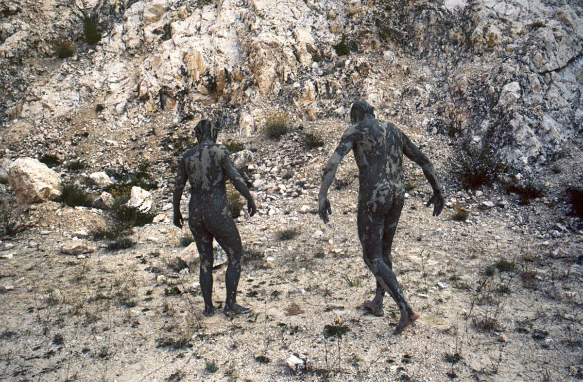 Die Arbeit besteht aus fünf, an der Wand hängenden Fotografien von zwei nackten Menschen, deren Haut vollständig mit Fangoerde bestrichen wurde (Fotos je 26,5 x 41 cm) und einem Stück Stoff (Betttuch, 65 x 154 cm) mit zwei Holzstäben auf dem Boden. Wie in der Fotoserie zu sehen, hatten sich die beiden auf je ein Betttuch gelegt und darauf Fangospuren hinterlassen. Diese Spuren fixierte ich nachträglich mit Leim und Kreide. Eines der Tücher zerschnitt ich und klebte die einzelnen Teile auf das andere Tuch.