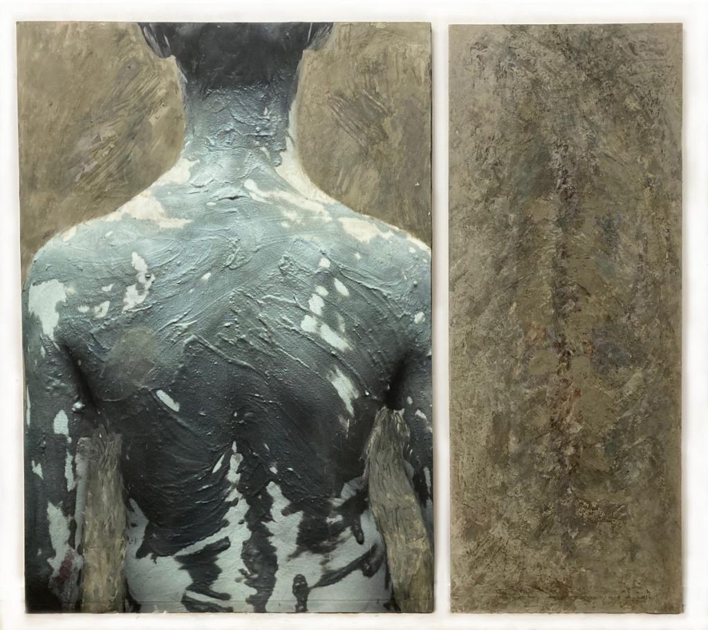 „Le Baigneur“, linker Teil: Foto (Cibachrom und Fangoerde im Hintergrund), rechter Teil Fangoerde, Wachs, Farbe auf Leinwand auf Holz, 165 x 185 cm, 1991/92